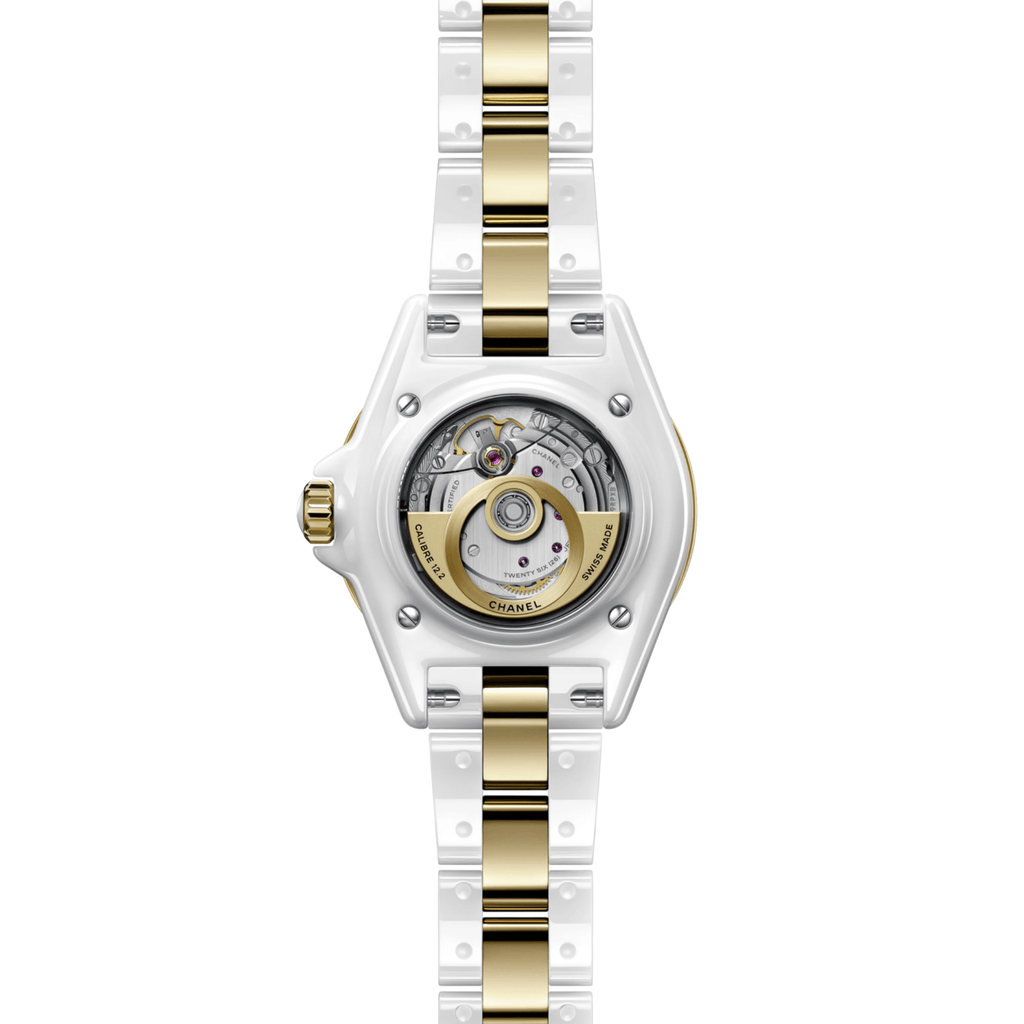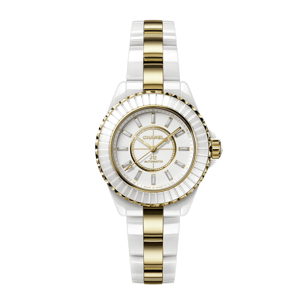 CHANEL J12 Watch Caliber 12.2 in a 33mm White ceramic and 18K yellow gold case with black dial on a white ceramic and 18K yellow gold bracelet, featuring an automatic movement with up to 50 hours of power reserve.