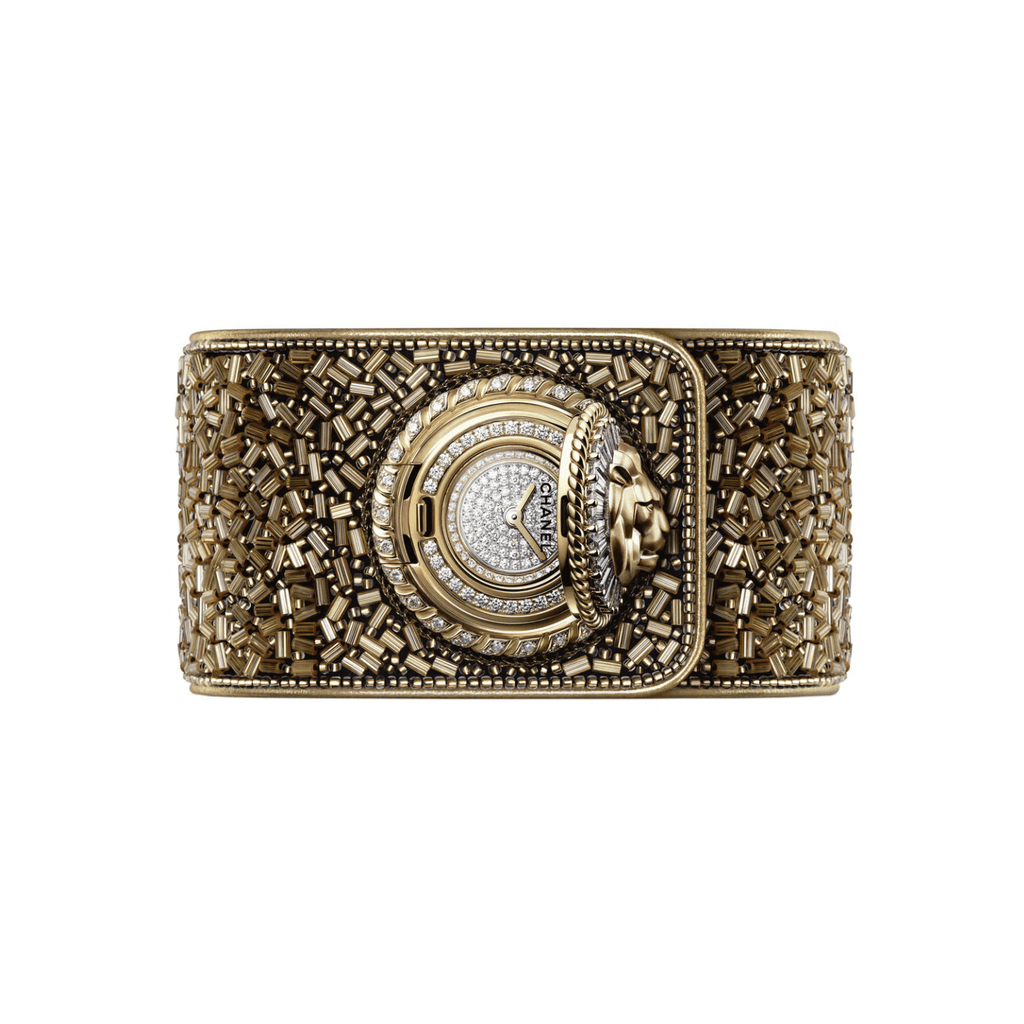 This CHANEL Mademoiselle Privé Bouton Lesage timepiece showcases a 25mm yellow gold case with a closed back and a white dial. It is complemented by a beige satin strap and powered by a precise quartz movement. The watch is beautifully set with 218 diamonds totaling 2.98 carats and offers water resistance up to 3 ATM (30 meters).
