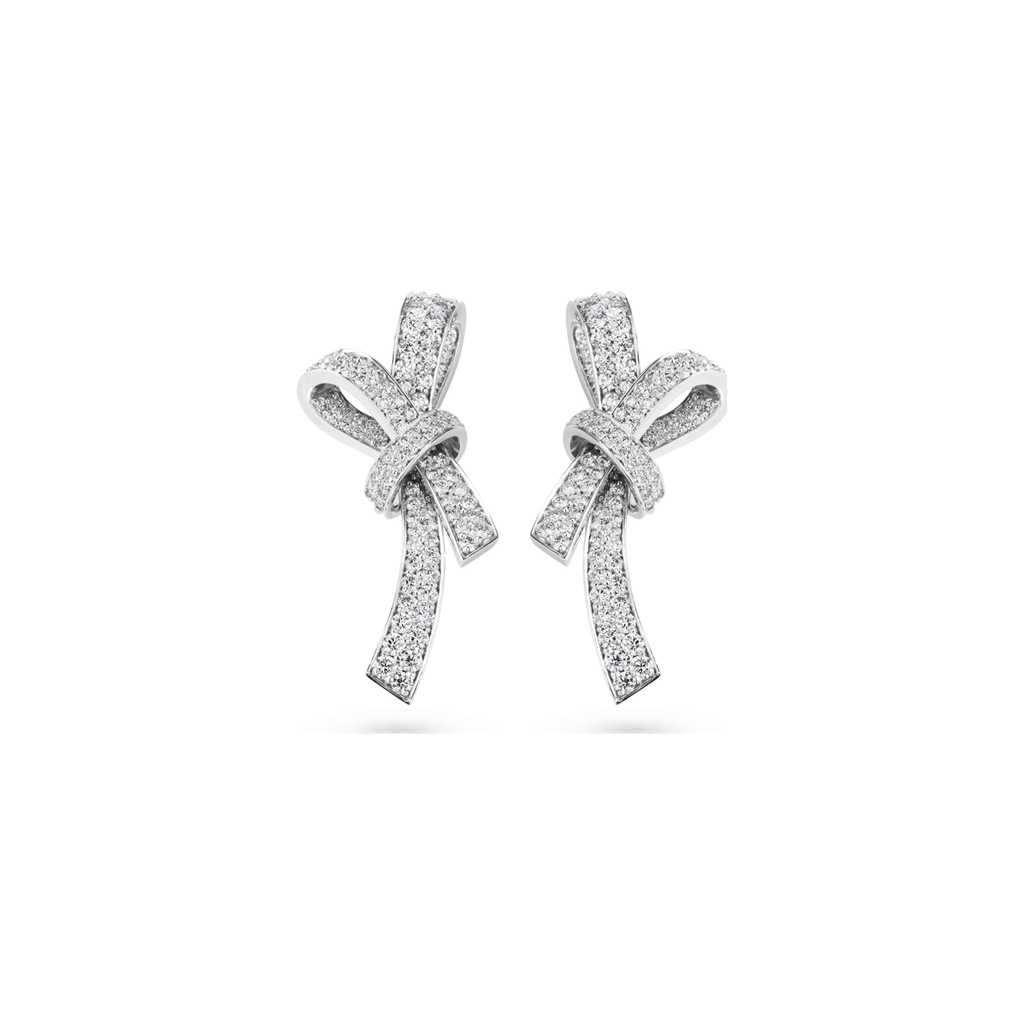 The CHANEL Ruban Earrings is crafted from 18K white gold and set with 104 brilliant-cut diamonds totaling 0.82 carat, complemented by a 1.03-carat pear-cut center diamond, certified by GIA.