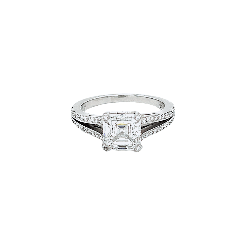 Made with platinum split shank engagement ring. Center store is an asscher-cut diamond, 2.01 carats, E color, VS 2 clarity.