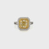 18 karat white and yellow gold fancy yellow diamond engagement ring with diamond halo and diamond pave