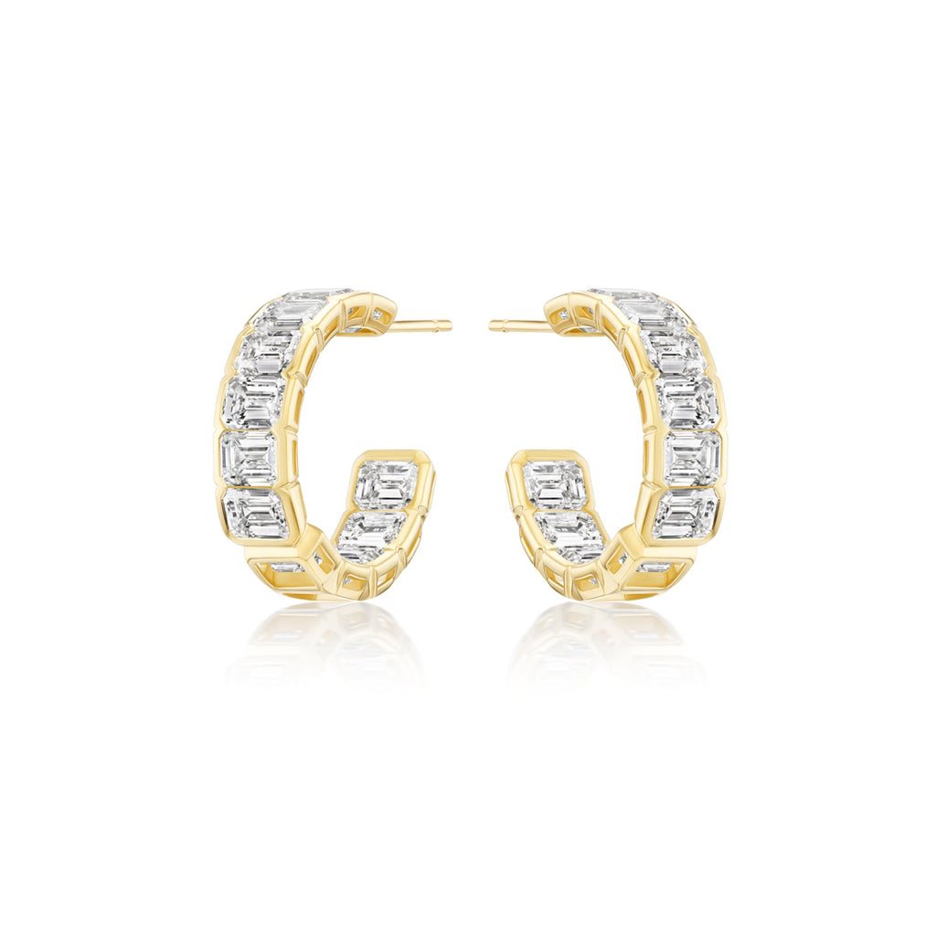 Diamond hoop earrings in 18 karat yellow gold with emerald cut diamonds totaling 7.82 carats.