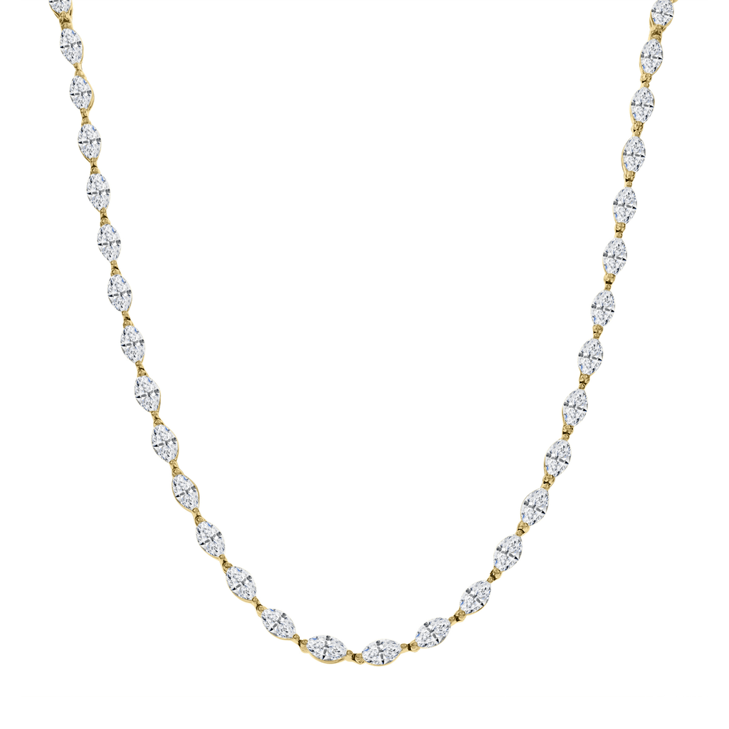This necklace is crafted in 18 karat yellow gold with marquise diamonds totaling 14.50 carats.