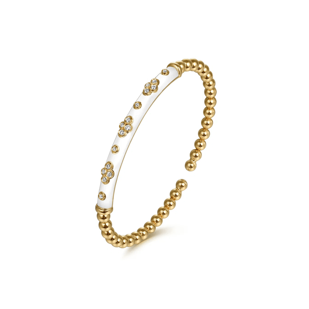 This Gabriel & Co. Bujukan Beads and Diamond Split Bangle Bracelet is expertly crafted from 14K yellow gold, showcasing an elegant design highlighted by white enamel and brilliant diamonds with a total weight of 0.22 carats.