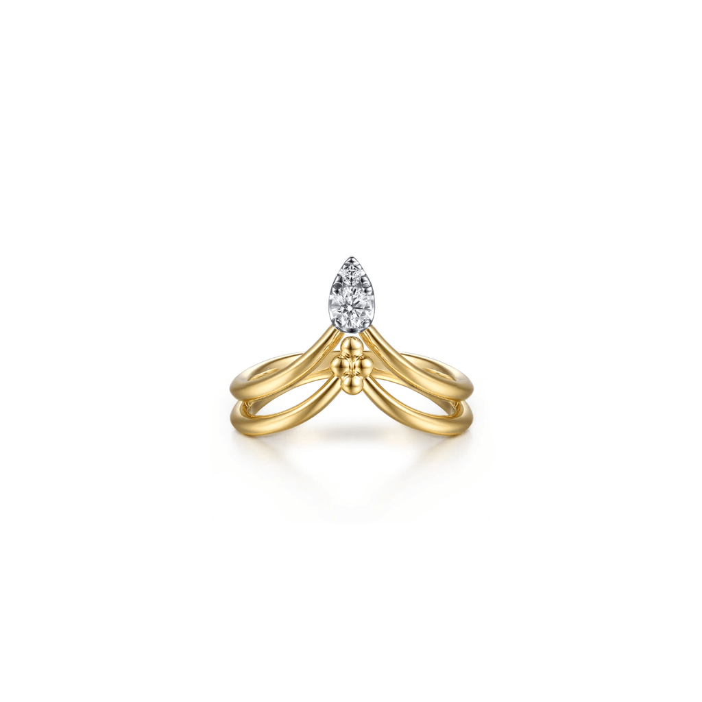 This Gabriel & Co. Bujukan Clover Diamond Chevron Ring is crafted from 14k yellow gold and adorned with diamonds totaling 0.15 carats, exemplifying sophisticated design and quality.