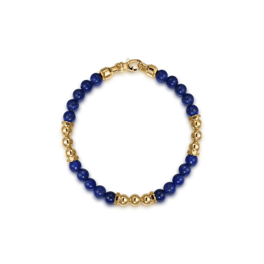 This 8-inch Gabriel & Co. bracelet showcases 6mm lapis beads set in 14k yellow gold, offering a sophisticated station design.