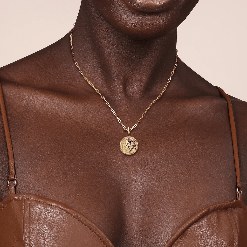 Gabriel & Co. Zodiac Leo Medallion Pendant crafted in 14K yellow gold, featuring Bujukan design and diamonds totaling approximately 0.03 carats.