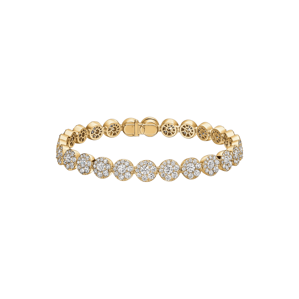The bracelet features a circle design showcasing the fiery brilliance of diamonds, totaling 6.4 carats. It is crafted in 18 karat yellow gold and measures 7 inches in length.