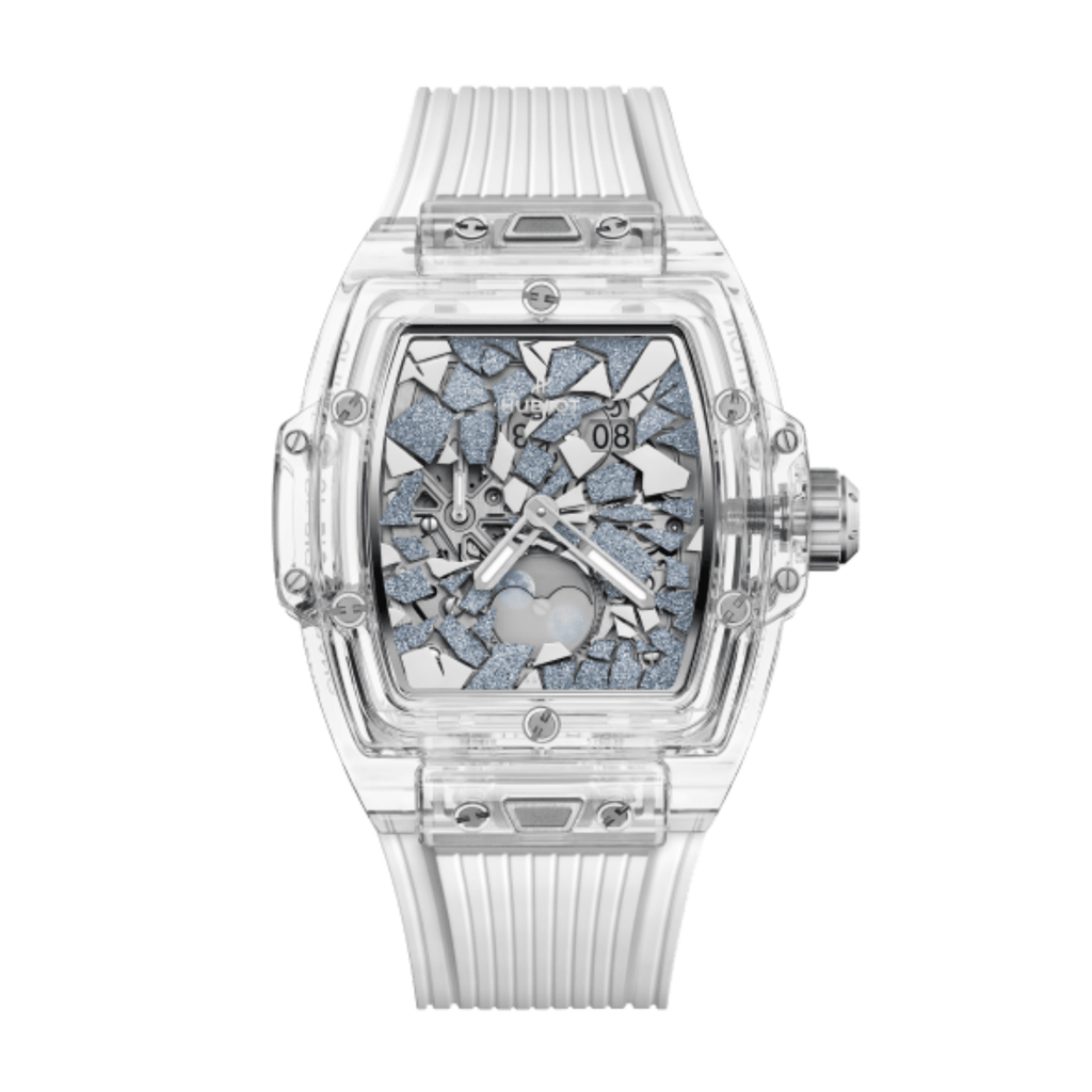 This 42 mm timepiece features a fully polished sapphire crystal case and matching polished sapphire crystal bezel, offering a sleek and transparent design. It is water-resistant up to 50 meters (5 ATM) and protected by a sapphire crystal with anti-reflective treatment. The dial is also crafted from sapphire crystal and enhanced with impact motif appliques, adding depth and visual intrigue. Powering the watch is the HUB 1770 self-winding skeleton moonphase movement, delivering an approximate power reserve of 50 hours. It is paired with white-lined rubber straps and secured by a titanium deployant buckle clasp.