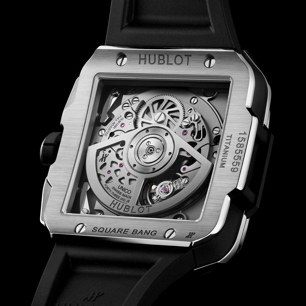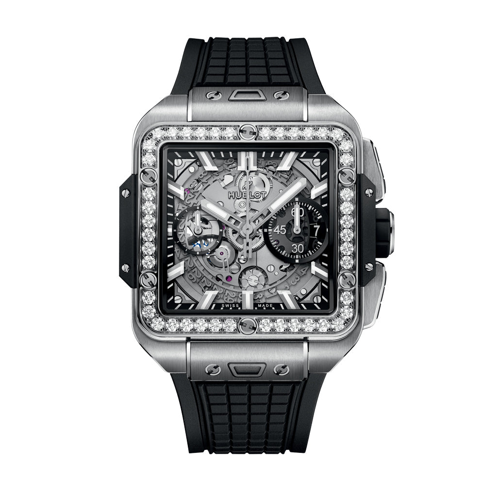 Hublot Square Bang Unico Titanium in a 42mm satin finished and polished titanium diamond bezel case with skeleton dial on black rubber strap, featuring a chronograph function and automatic movement with approximately 72 hours power reserve.