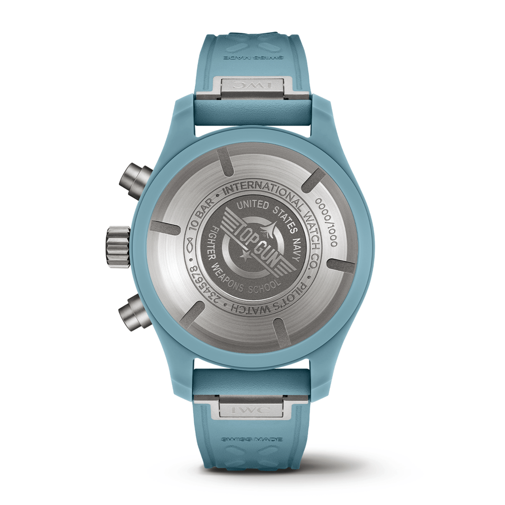 The Pilot’s Watch Chronograph 41 TOP GUN Miramar showcases a ceramic case in the exclusive IWC TOP GUN Miramar hue, a subtle light blue created with PANTONE®. It includes day and date functions, is limited to 1,000 units, offers water resistance up to 10 bar, and is powered by an automatic movement with a 46-hour power reserve.