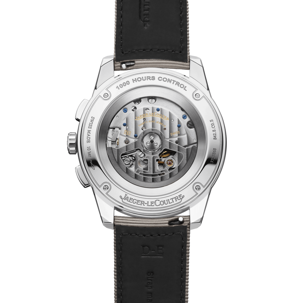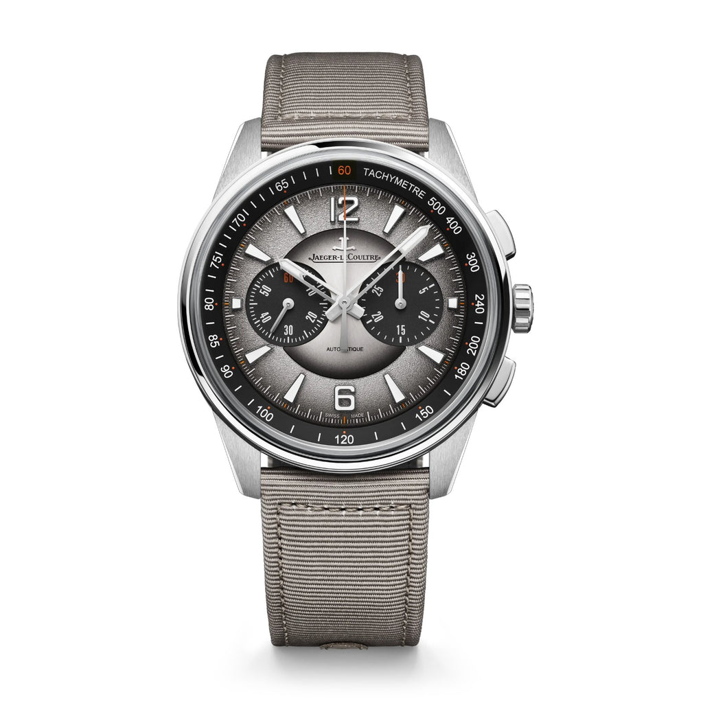 The Polaris Chronograph features a superb signature dial in lacquered gray. From the lightest to the darkest, the gradation of multiple nuances is achieved thanks to a process that consists of applying almost 40 layers of varnish followed by colored and transparent lacquer to the dial before the final step: polishing. In its 42 mm steel case, the dial has three levels of finishing: an internal opaline bezel, a grained circle for the hours and indexes, as well as a sunray-brushed center. Perfectly legible, the chronograph stands out for its iconic attributes: central second, tachymeter and 30-minute counter at 3 o’clock. Highlighting the Maison’s watchmaking expertise, its Jaeger-LeCoultre Calibre 761 features an integrated chronograph mechanism, equipped with a column-wheel with vertical clutch. The Polaris Chronograph promises 65 hours of power reserve - very welcome for a watch built for adventure. Graced with sporty and functional elegance, it comes with a beige fabric strap and another in black rubber.