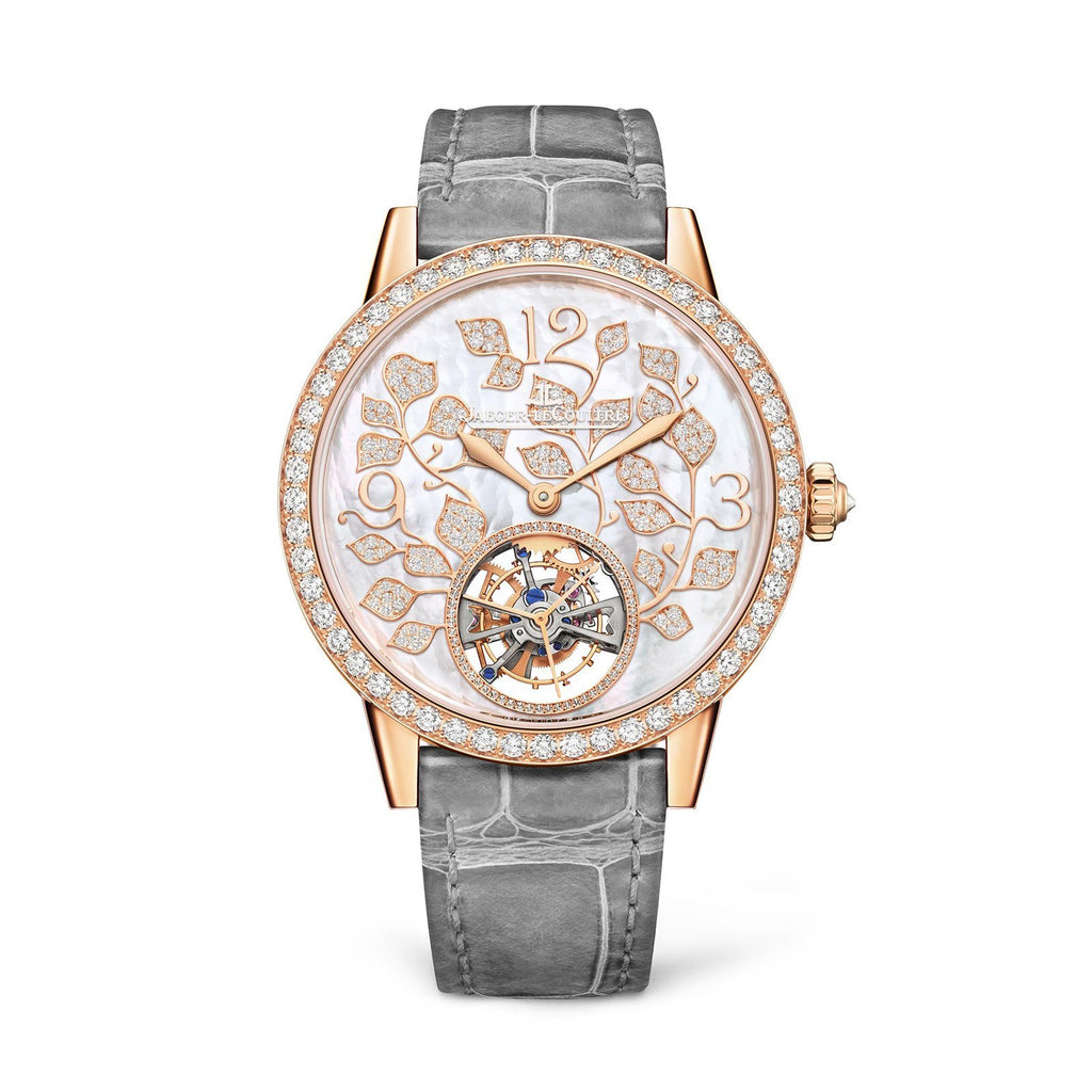Jaeger-LeCoultre Rendez-Vous Ivy Tourbillon in a 39mm rose gold diamond bezel case with mother-of-pearl dial on leather strap featuring a tourbillon complication and automatic movement.