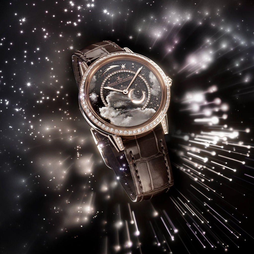 Inspired by the magic of shooting stars, the artisans of Jaeger-LeCoultre’s Métiers Rares® (Rare Handcrafts™) atelier have harnessed their skills in new ways to depict the beauty and mystery of the night sky. Made of transparent sapphire glass, the uppermost of the dial’s three layers has been sprinkled with transferred stars and miniature hand-painted (on both sides of the sapphire glass) with clouds and a crescent moon, which conceal the shooting star when it is inactive.