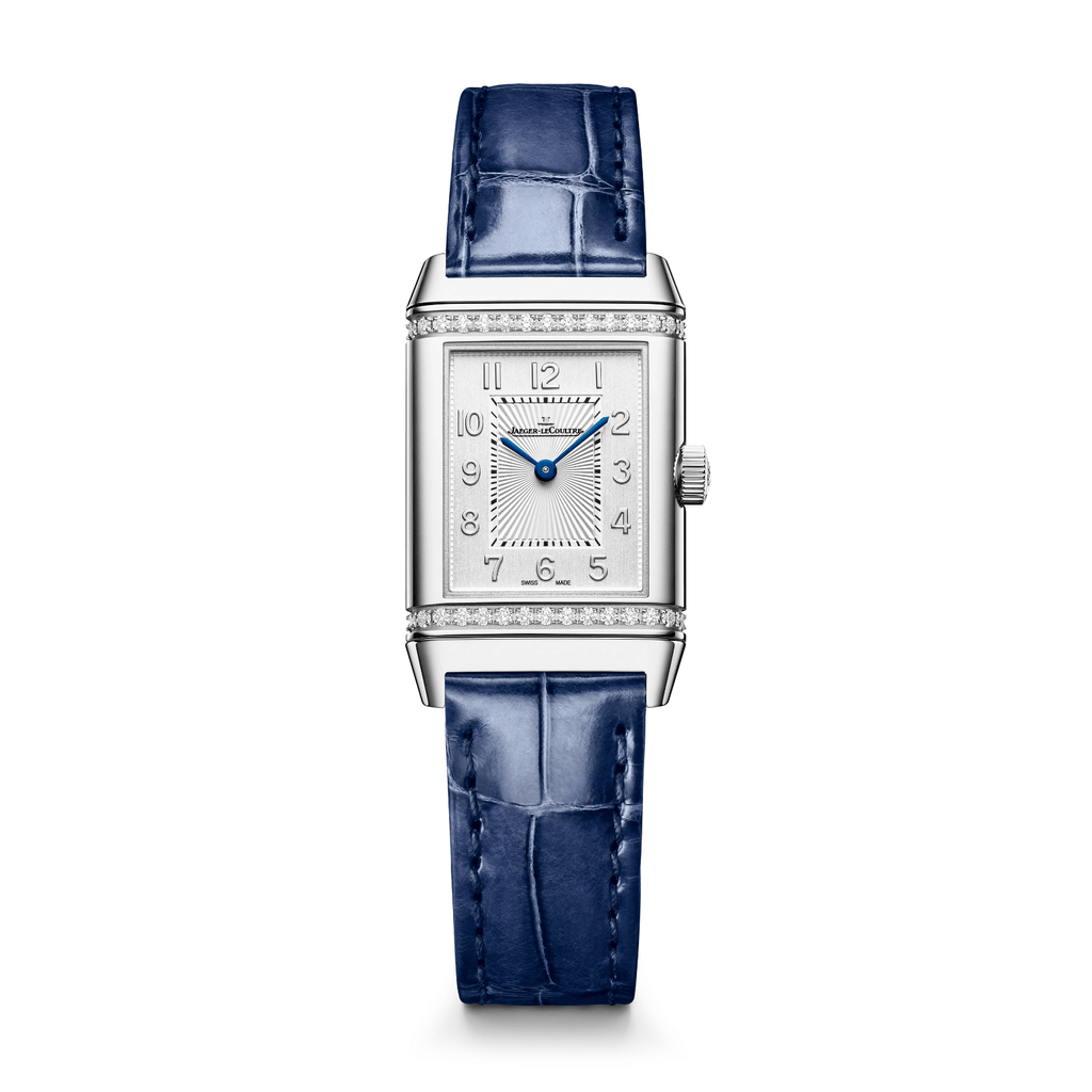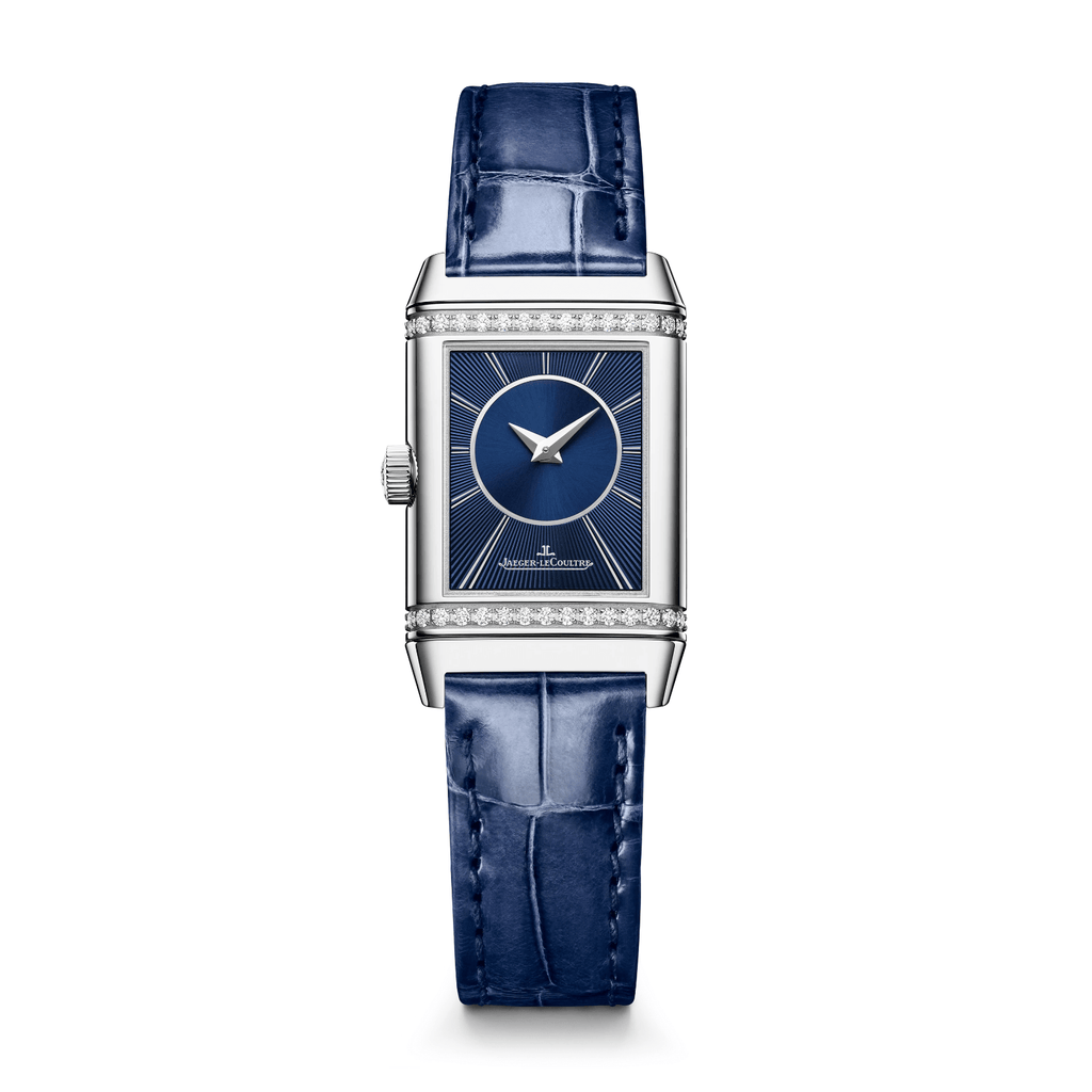 The Reverso Classic Small Duetto embodies the collection's enduring style and dual elegance with its 34.2 x 21 mm stainless steel case featuring diamond-set signature gadroons. Its front dial showcases a refined look, with the logo and hour markers tone-on-tone with the case. Flipping the case unveils a second darker dial with double-ray indexes and a central sunray brushed finish, providing a unique time display. The in-house manual Calibre 844 powers the watch, offering a 50-hour power reserve. A sophisticated and interchangeable blue alligator strap completes this timepiece.
