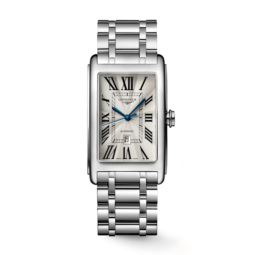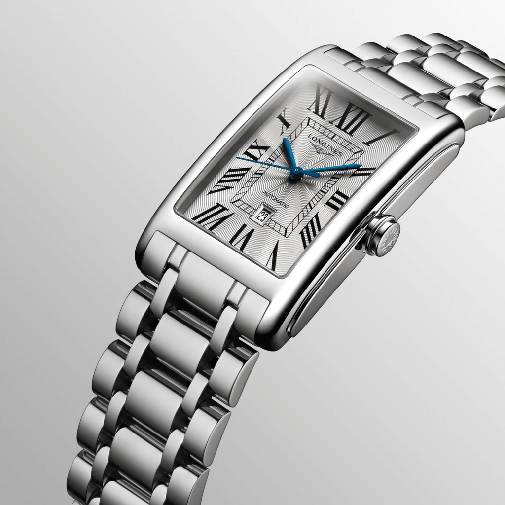 Longines Dolcevita automatic watch featuring a refined 28.2 x 47mm stainless steel case. Powered by a self-winding mechanical movement with 28,800 vibrations per hour and an impressive 45-hour power reserve. The silver flinqué dial is protected by a scratch-resistant sapphire crystal, while the watch offers 3 bar water resistance for everyday wear. Includes a stainless steel bracelet with a secure triple safety folding clasp and push-piece opening mechanism.