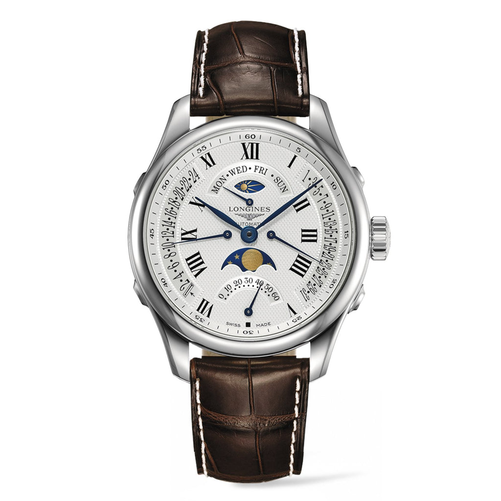 Longines Master Collection Retrograde in a 41mm stainless steel case with silver dial on leather strap, featuring a retrograde day, retrograde date, power reserve indicator, moonphase, and an automatic movement with up to 48 hours of power reserve.