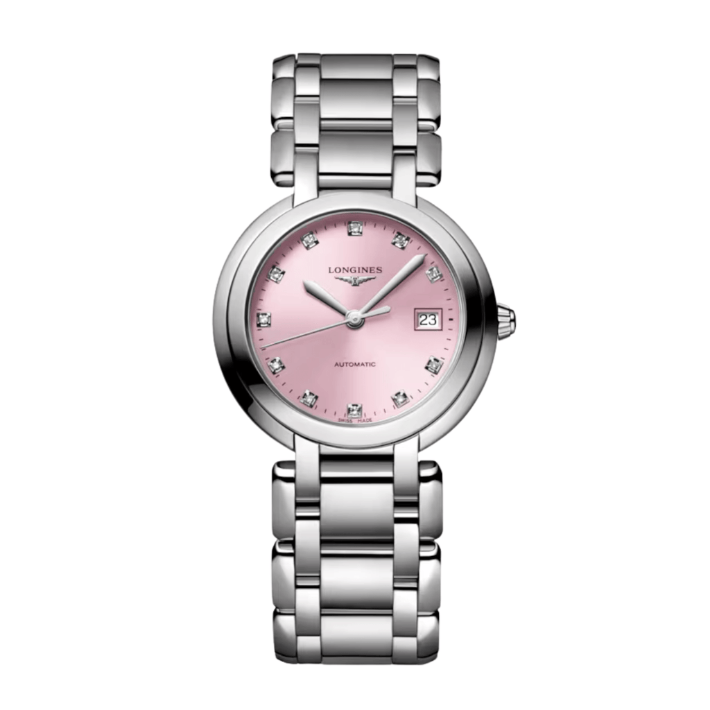 This model features a 30mm stainless steel case, sunray pink dial. Water resistance of 3 bar. Scratch-resistant sapphire crystal, with several layers of anti-reflective coating on the underside. Automatic movement, date. Stainless steel bracelet with triple safety folding clasp and push-piece opening mechanism.