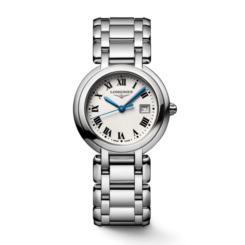 This refined timepiece features a 30mm stainless steel case housing a reliable quartz movement with date display. The opaline ivory dial is protected by a scratch-resistant sapphire crystal with multi-layer anti-reflective coating for optimal clarity. Water resistance to 3 bar ensures everyday durability, while the matching stainless steel bracelet incorporates a triple safety folding clasp with push-piece mechanism for secure wear.