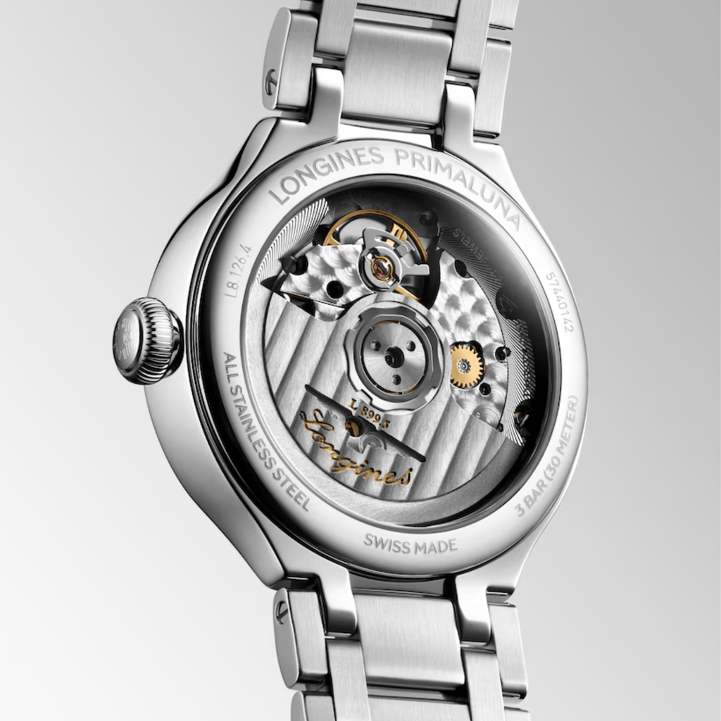 Longines PrimaLuna Moonphase in a stainless steel 34mm case with silver dial on stainless steel bracelet, featuring a moon phase, date, and automatic movement with up to 72 hours of power reserve. Water resistance of 3 bar.