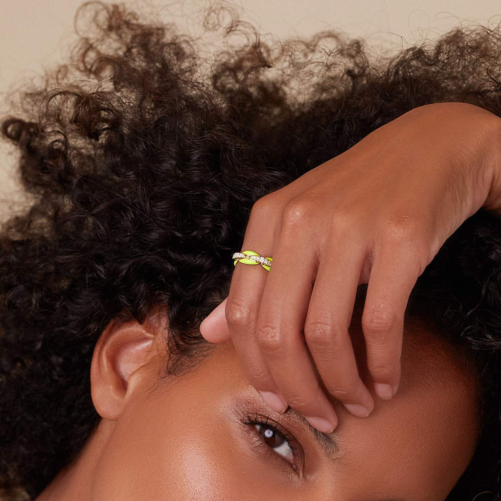 18k yellow gold ring with diamonds and neon yellow enamel