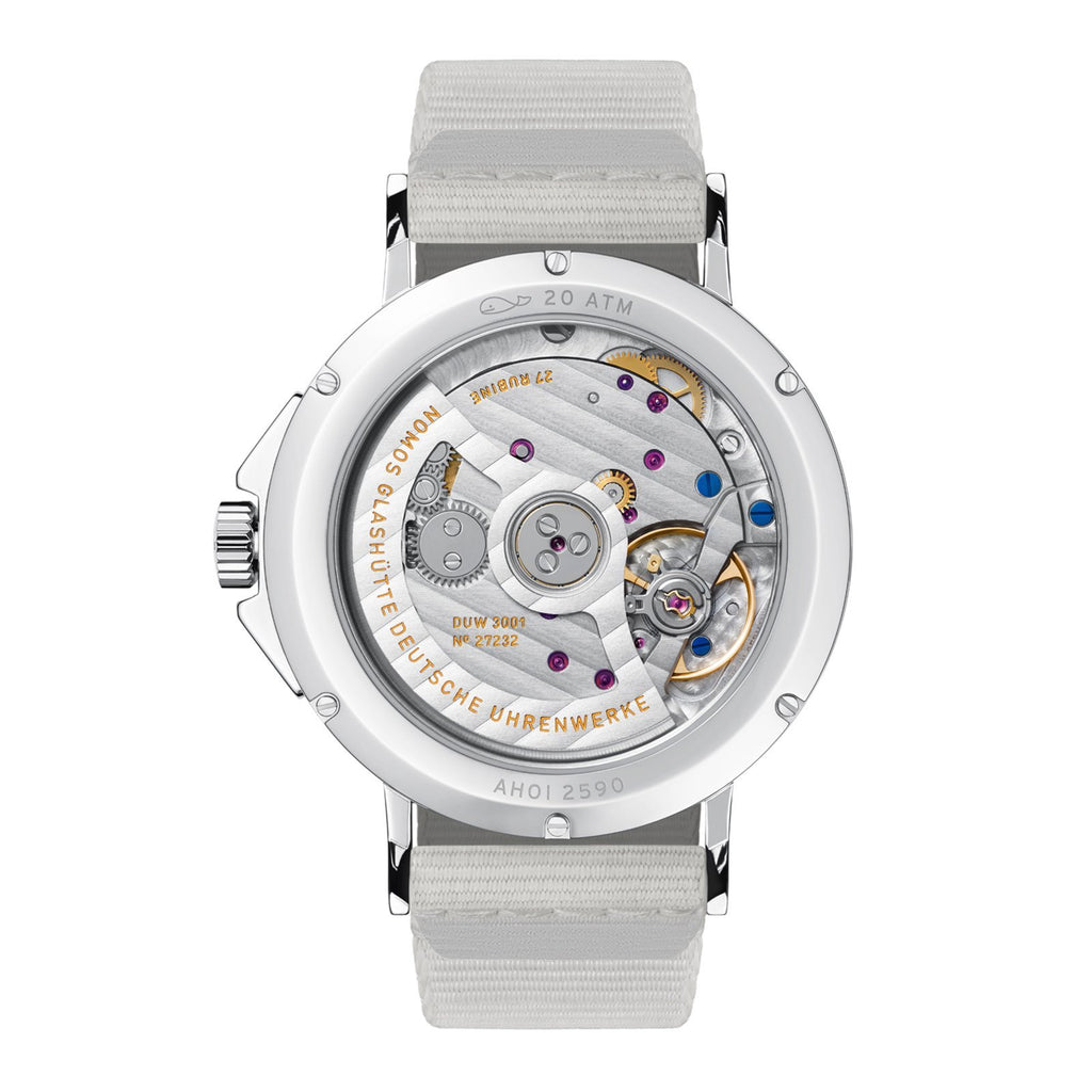 Ahoi in a somewhat smaller size, thanks to the ultra-thin automatic caliber DUW 3001 with the NOMOS swing system (visible through the sapphire crystal glass back). Ahoi neomatik is water resistant to 20 atm, so suitable for diving, equipped with a crown guard, its back fixed with six screws—all in all: elegant, sporty, and classic in a diameter of 36 millimeters.