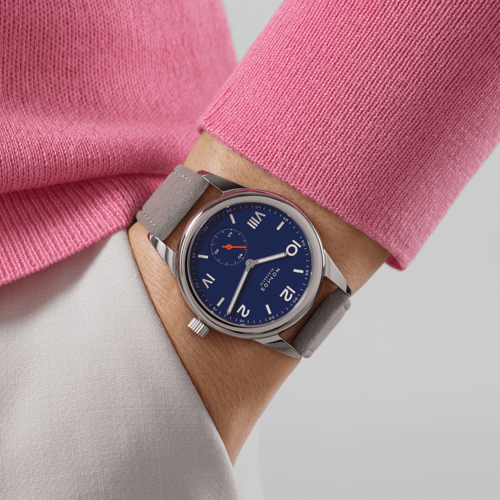 This 36mm watch features a stainless steel bipartite case, sapphire crystal glass back, and screw detailing. The blue dial includes a small seconds display, while the manual winding movement offers a power reserve of 43 hours. With a water resistance of 10 atm, this watch is paired with a vegan velour remborde velvet gray strap.
