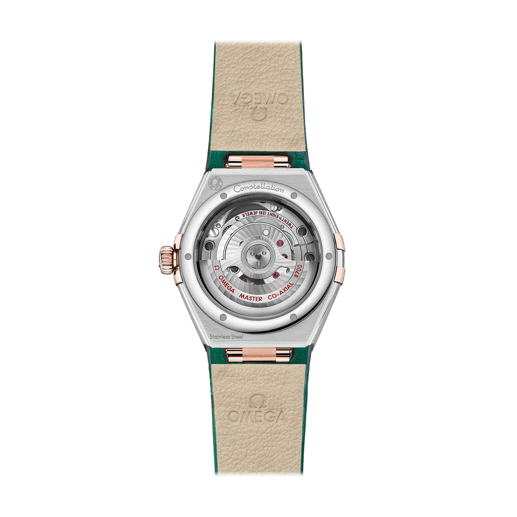 At the heart of this timepiece is the OMEGA Co-Axial Master Chronometer Calibre 8700, visible through the domed scratch-resistant sapphire crystal.