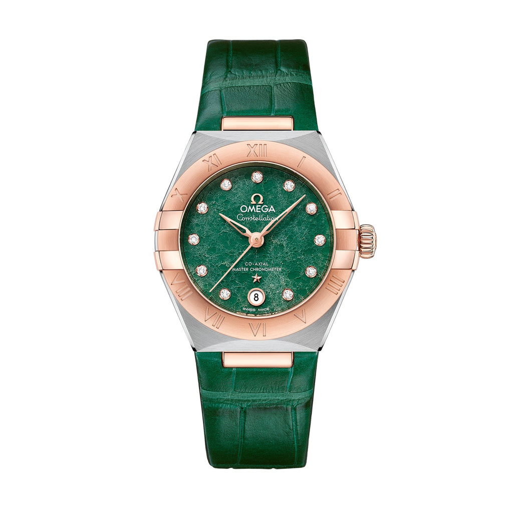 Crafted in stainless steel and 18K Sedna™ gold, it has a bezel engraved with Roman numerals and a date window at 6 o’clock. The hands, hour markers, OMEGA logo and Constellation star are in 18K Sedna™ gold.