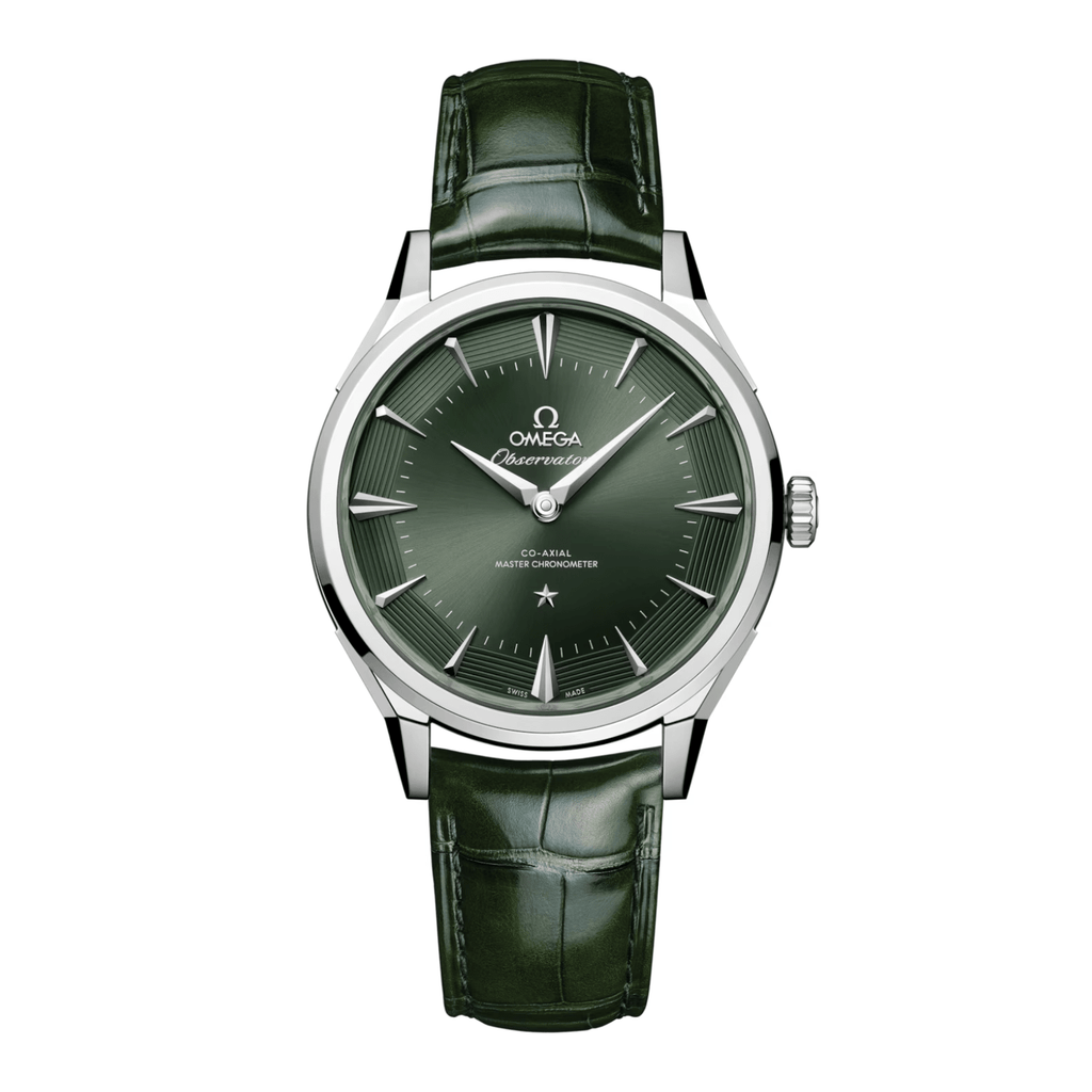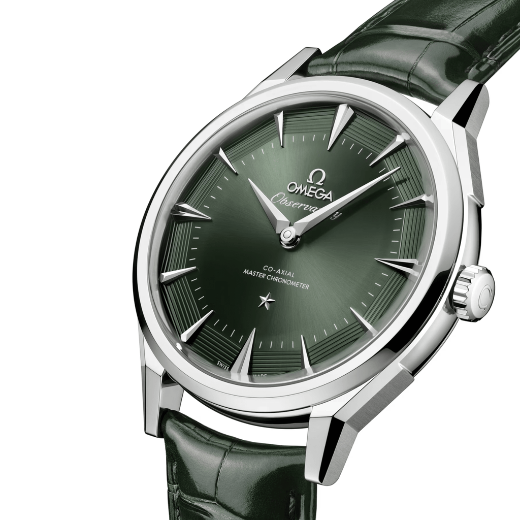 The “Pie-Pan” dial is a reminiscent of the original 1952 Constellation with dodecagonal facets, with applied OMEGA logo and Constellation star. The green dial is presented with sun-brushed centre and opaline facets with 8 embossedgrooves. The revamped kite-form indexes are fully diamond-polished, matched with diamond-polished kite-form hands, crafted from 18K white gold.