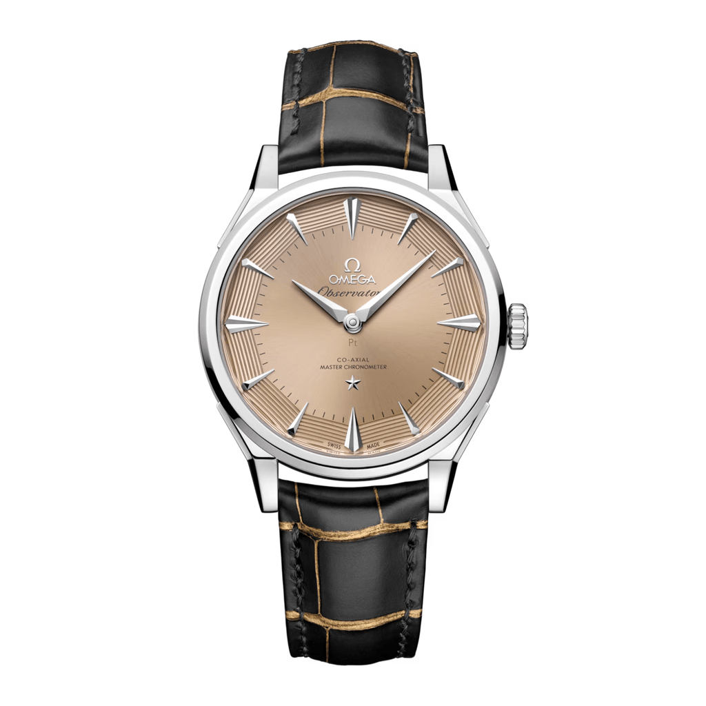 The “Pie-Pan” dial is a reminiscent of the original 1952 Constellation with dodecagonal facets, with applied OMEGA logo and Constellation star. The 950 platinum-gold PVD coated with platinum in yellowish hue dial is presented with sun-brushed centre and brushed facets with 8 matte hand-guillochégrooves. The revamped kite-form indexes are fully diamond-polished, matched with diamond-polished kite-form hands, crafted from 18K white gold PVD coated with 950 platinum-gold.