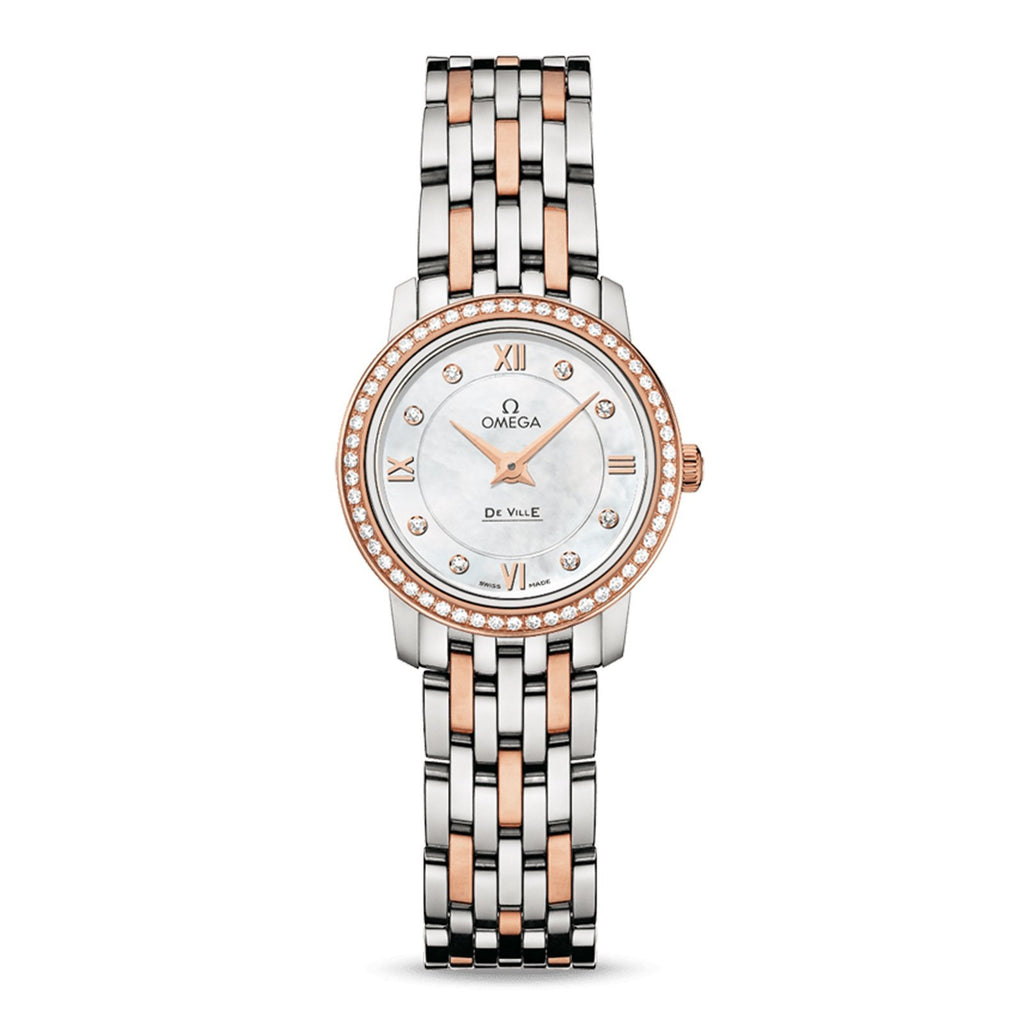 The diamond-set, 18K red gold bezel is mounted on a 24.4 mm stainless steel casebody and is presented on a two-tone steel and red gold-coloured bracelet. At the heart of this timepiece is the OMEGA quartz calibre 1376.