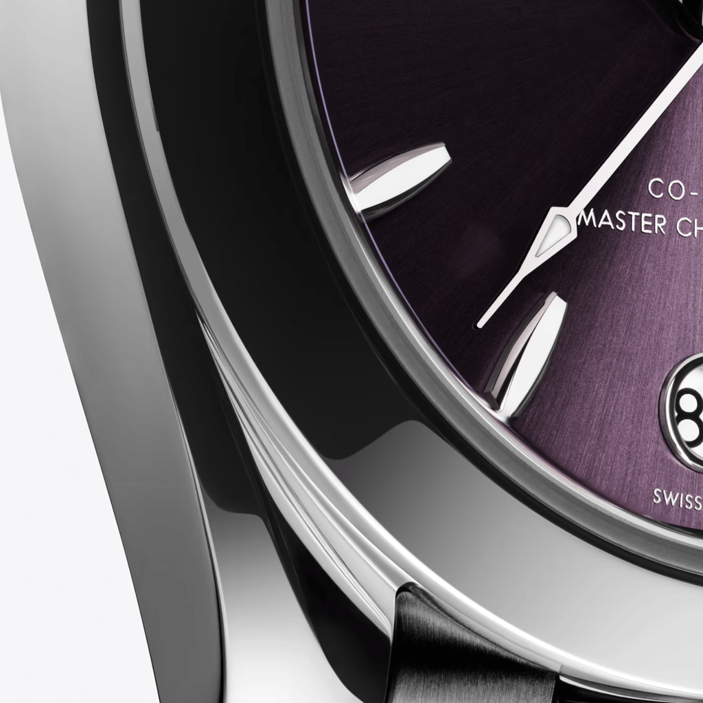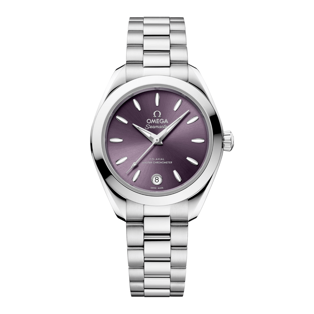 This Omega Seamaster Aqua Terra features a 30mm stainless steel case paired with a purple dial. It offers water resistance up to 15 bar and is powered by an automatic movement with a 48-hour power reserve. The watch includes a date function and is secured by a stainless steel bracelet.