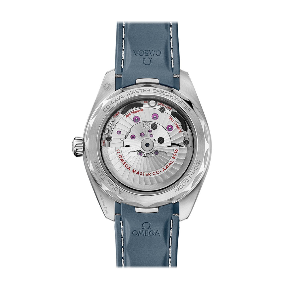 Presented on a structured blue rubber strap with grey stitching, this timepiece is powered by the OMEGA Co-Axial Master Chronometer calibre 8916, certified at the industry’s highest standard by the Swiss Federal Institute of Metrology (METAS)