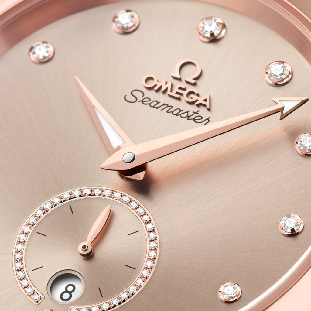 The sun-brushed linen dial is distinguished by a date window at 6H and a Small Seconds subdial featuring an 18K Sedna™ gold ring set with diamonds. The design is further complemented by 18K Sedna™ gold hands filled with white Super-LumiNova, as well as incremental diamond indexes that are set in 18K Sedna™ gold holders.