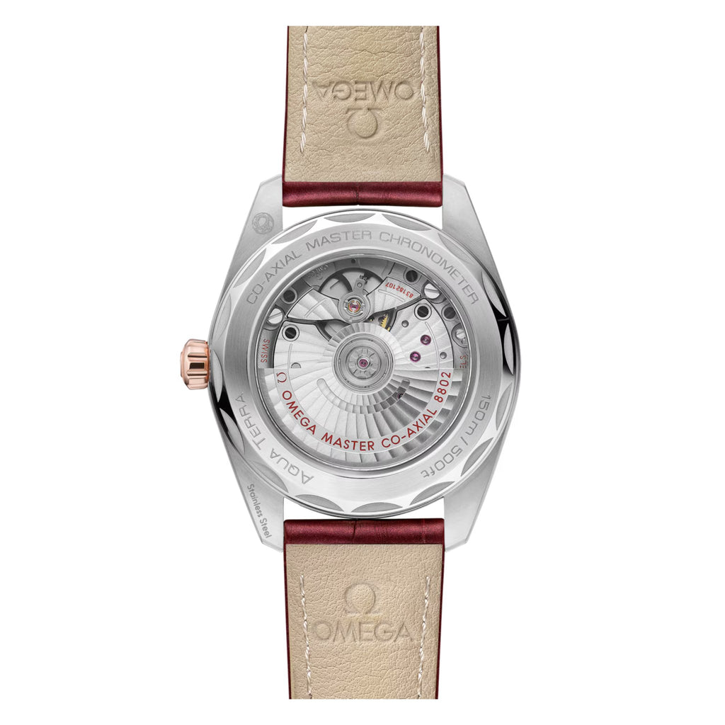 Presented on a burgundy leather strap, this timepiece is powered by the OMEGA Co-Axial Master Chronometer calibre 8802, certified at the industry’s highest standard by the Swiss Federal Institute of Metrology (METAS).