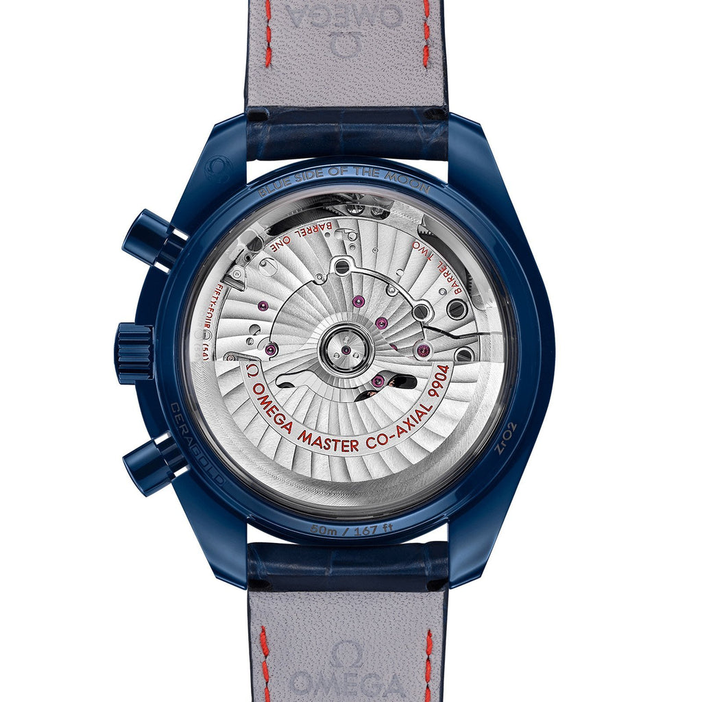 The 44.25 mm chronograph features a blue ceramic case complemented by a blue ceramic bezel ring with an OMEGA Ceragold™ tachymeter scale. It is presented on a blue leather strap with a blue ceramic and ceramised titanium foldover clasp.