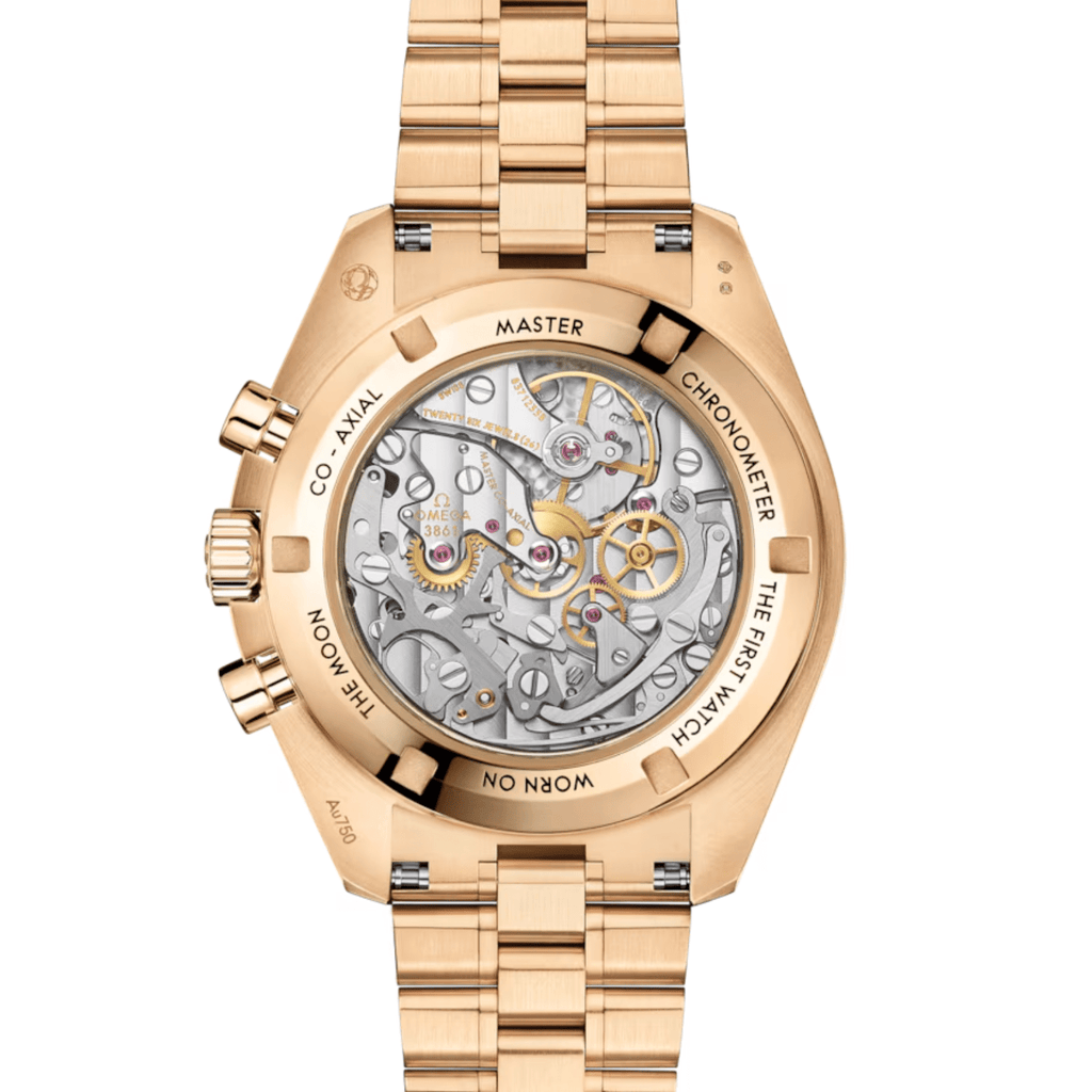 This 42 mm model in 18K Moonshine™ Gold features sapphire crystal glass on both the front and caseback, presented on a polished-brushed bracelet in the same precious metal. The design draws inspiration from the 4th generation Speedmaster worn on the moon. Its black varnished and lacquered double plate step dial is complemented by white varnished and lacquered subdials set within rhodium-plated frames. Details include the OMEGA logo, hands and indexes in 18K Moonshine™ Gold and the famous dot over 90 on the black ceramic bezel ring.