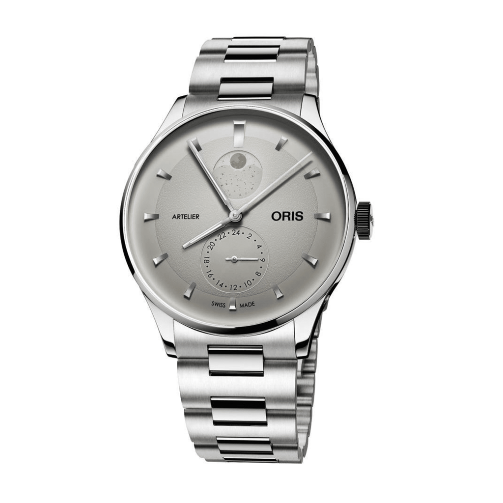 Discover timeless sophistication with the Oris Artelier Complication, a 39mm stainless steel masterpiece featuring an ivory dial that exudes understated elegance. This automatic watch boasts a robust 41-hour power reserve and 3 bar water resistance for dependable everyday wear. The dial showcases three distinctive complications: a moon phase indicator at 12 o'clock, a second time zone at 6 o'clock, and a stop-second function for precise timing control. Refined centre hands display hours, minutes, and seconds with classic restraint. Complemented by a multi-piece stainless steel bracelet with secure butterfly clasp and transparent caseback, this timepiece seamlessly blends technical precision with refined aesthetics.
