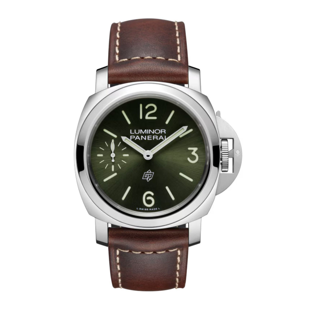 The stainless steel case of this 44mm Panerai Luminor Logo timepiece boasts a sun-brushed green dial and a water resistance of 10 bar. Its small seconds display, manual movement, and 3-day power reserve make it a reliable choice. Complementing the luxurious design is a dark brown Calf Ponte Vecchio strap.