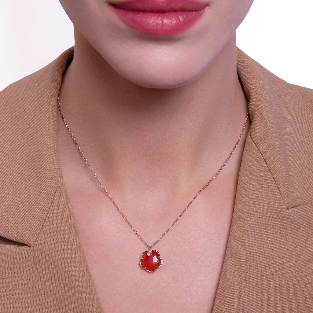 Pasquale Bruni Ton Joli Petit Joli Necklace in 18K rose gold with red carnelian and diamonds totaling 0.04 carats.