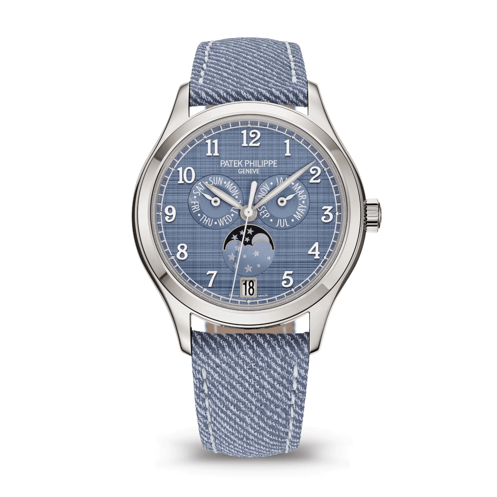 A contemporary-style Annual Calendar with a white gold 38 mm-diameter case and a blue-gray dial enhanced by a double vertical and horizontal satin finish reminiscent of raw silk “shantung” fabrics, teamed with a matching blue-gray calfskin leather strap with a denim pattern and contrasting white stitching. A sapphire crystal case-back provides a chance to admire the architecture of self-winding 26-330 S QA LU caliber.