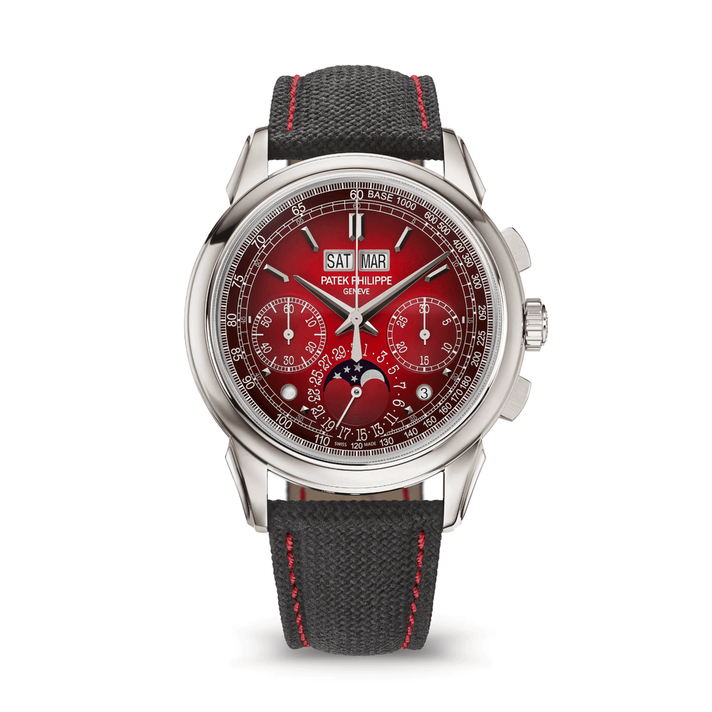 Patek Philippe revisits its split-seconds chronograph with perpetual calendar by treating it to a white gold case and a sunburst navy blue dial. The navy-blue composite strap with a fabric pattern and contrasting red stitching brings an undeniably sporty look...