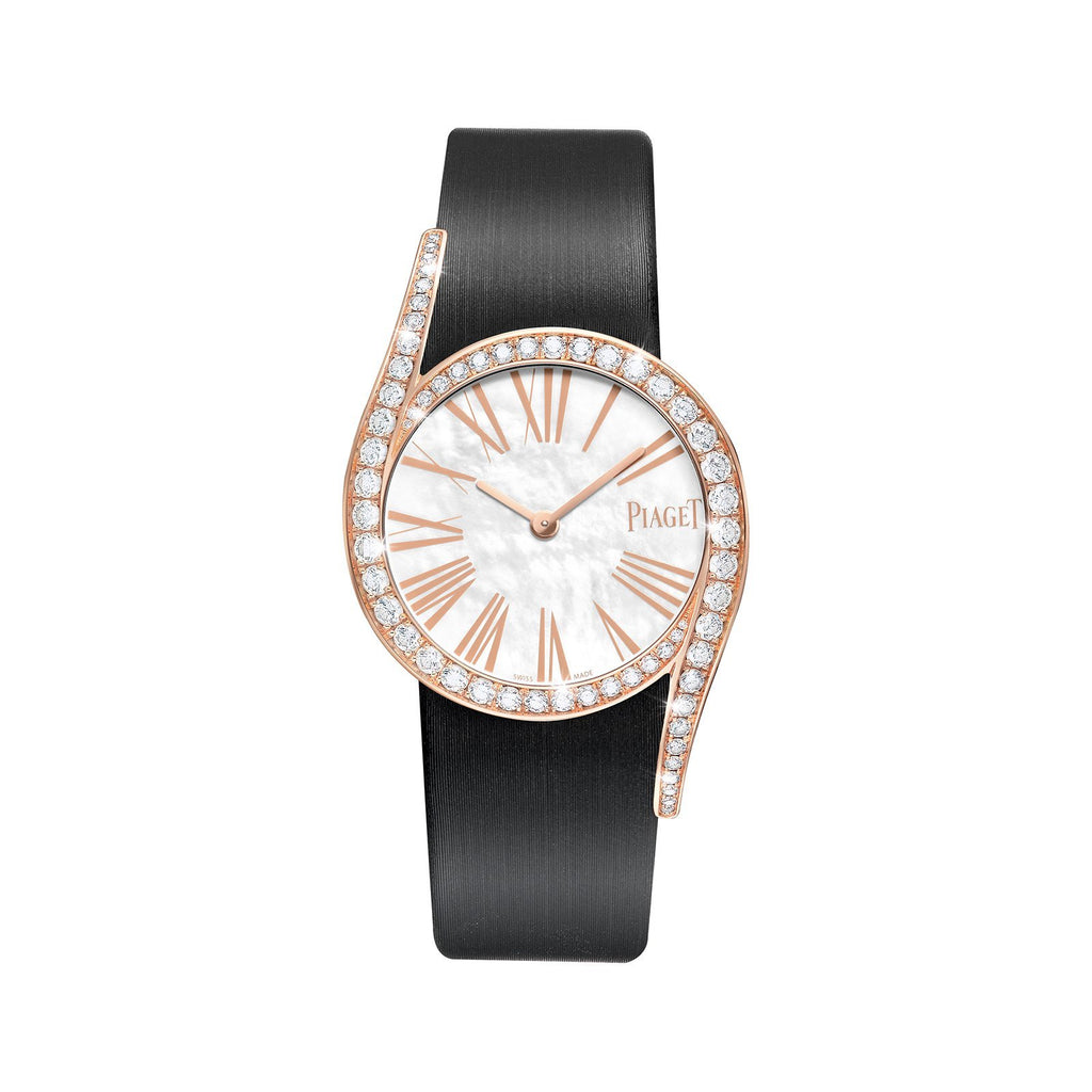 Radiant, vibrant and seductive: these are three adjectives that perfectly capture the spirit of this new luxury watch created by Piaget. It takes the linearity out of time, placing it instead on a curve of pure femininity. Its round 32 mm rose gold case houses the Piaget 430P ultra-thin hand-wound Manufacture movement and is enhanced by two elegant elongated lugs. The voluptuousness of its curves is highlighted on the bezel by a graduated row of round diamonds. The purity of its mother-of-pearl dial has a very contemporary classicism, with its Roman numerals in powdered rose gold in striking contrast with the black satin strap closed by a gem-set gold pin buckle.
