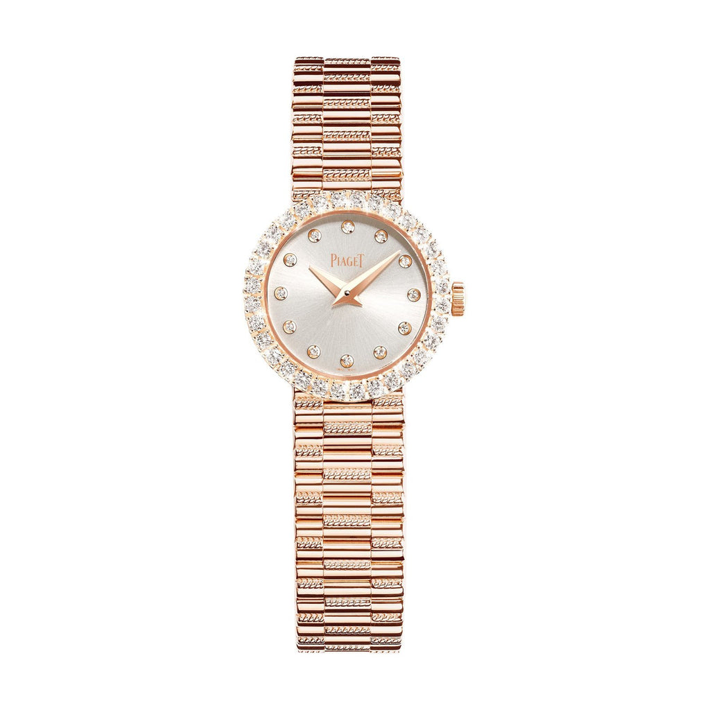 Women’s watch in rose gold and diamonds. Silvered gem-set dial. Bracelet in rose gold. This luxury women’s watch exudes retro charm in an incarnation of Piaget’s historic expertise. Its traditional curves are highlighted by an extremely flexible rose gold bracelet, recognizable by its twisted threads finely soldered to the links. The product of Piaget’s artisanal expertise. Water-resistant to 30 meters, its round 19 mm diameter rose gold case is set with 32 brilliant-cut diamonds and features an elegant silvered dial with gem-set hour markers.