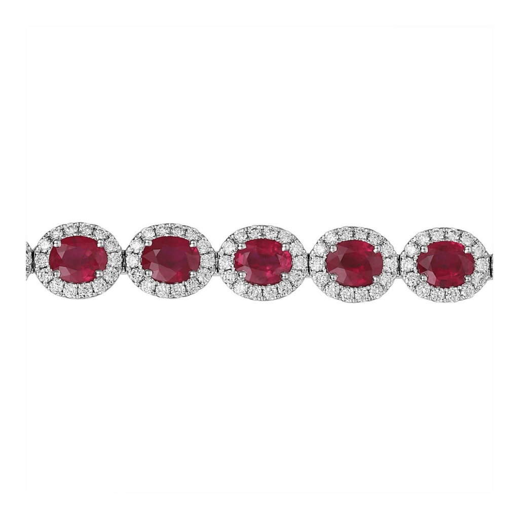 Crafted in 18K white gold, this 7-inch bracelet features a breathtaking line of oval brilliant cut rubies, totaling 10.10 carats. Each ruby is elegantly embraced a halo of white diamonds with a combined total weight of 3.00 carats. This is a luxurious and timeless statement piece, perfect for celebrating a special milestone or adding a sophisticated cascade of color to an evening look.