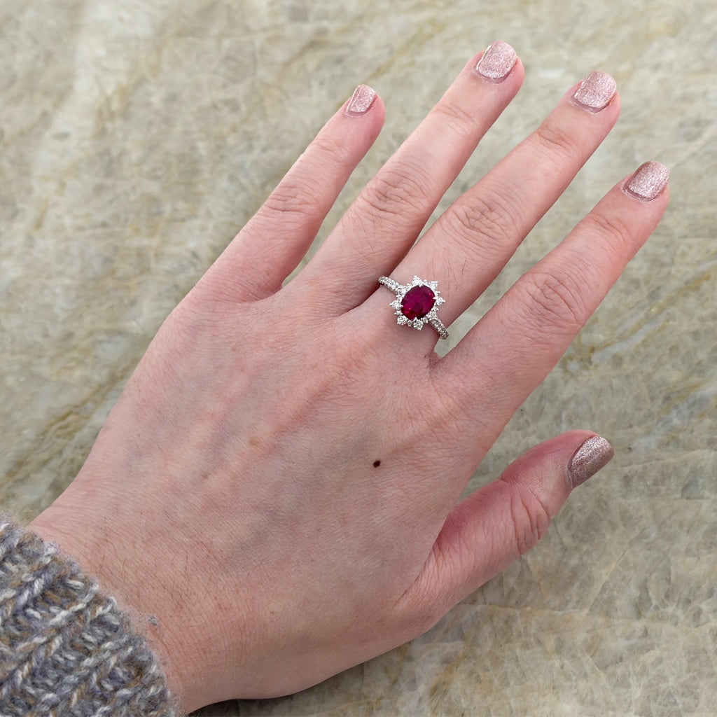 This exquisite ring features a vibrant 0.46 carat ruby center, brilliantly amplified by a sparkling halo of round diamonds totaling 0.33 carats in 18 karat white gold setting