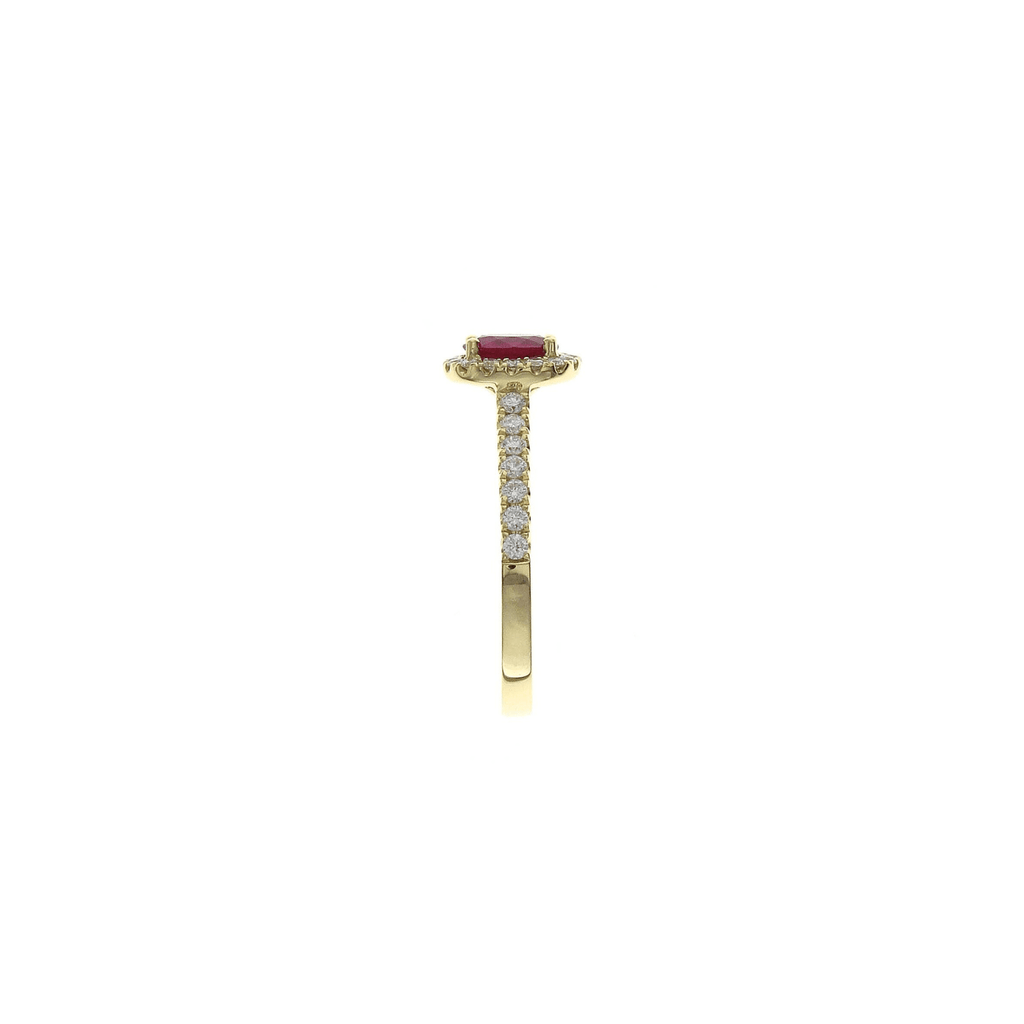 This 18k yellow gold ring features a 0.75-carat ruby complemented by diamonds totaling approximately 0.34 carats, showcasing expert craftsmanship and refined elegance.