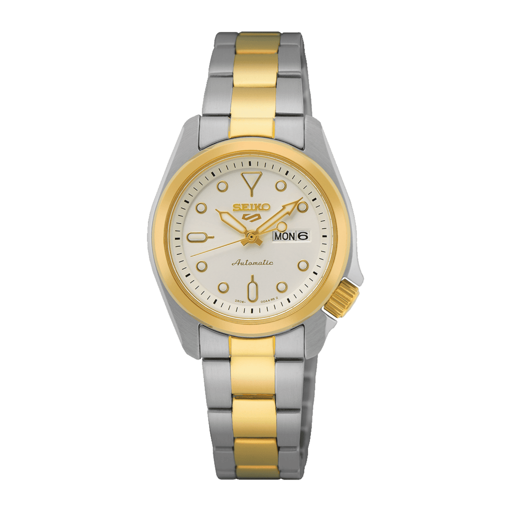This timepiece features a 28mm stainless steel case coated with yellow gold PVD and a white dial. It includes day and date functions and is powered by an automatic movement with a 40-hour power reserve. The watch is water-resistant up to 10 bar and is paired with a stainless steel bracelet also finished in yellow PVD.
