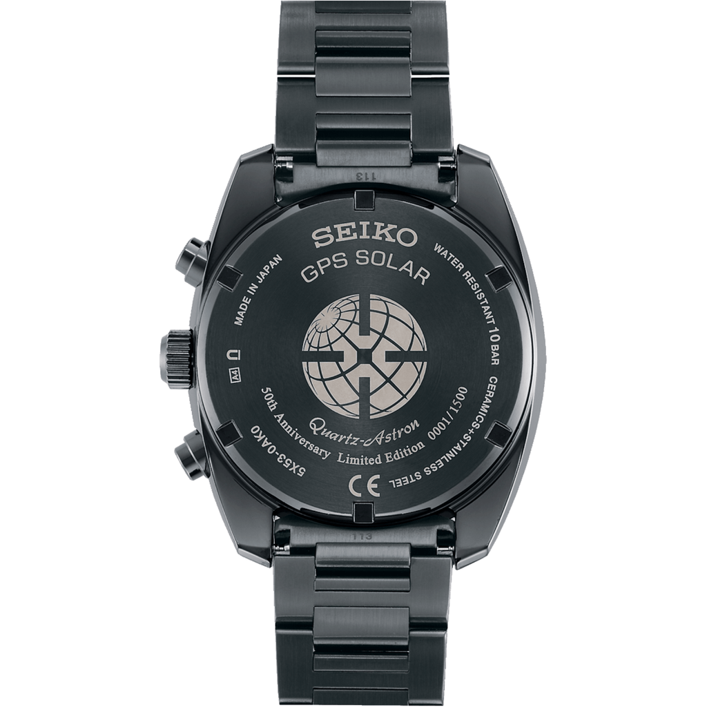 This exclusive Seiko Astron Quartz SSH023 commemorates the 50th anniversary with a limited run of 1,500 units. It features a 42mm stainless steel case and bracelet treated with a super hard coating, complemented by a ceramic bezel and black dial. Powered by GPS solar technology, this timepiece includes advanced functions such as overcharge prevention, power saving, and a perpetual calendar validated through February 2100. It offers 39 time zones with world time and dual-time displays, day and power reserve indicators, and seamless time transfer between dials. Additional sophisticated features include satellite reception status, automatic time zone and daylight saving adjustments, in-flight mode to prevent GPS signal reception, and hand position auto-alignment for precision.